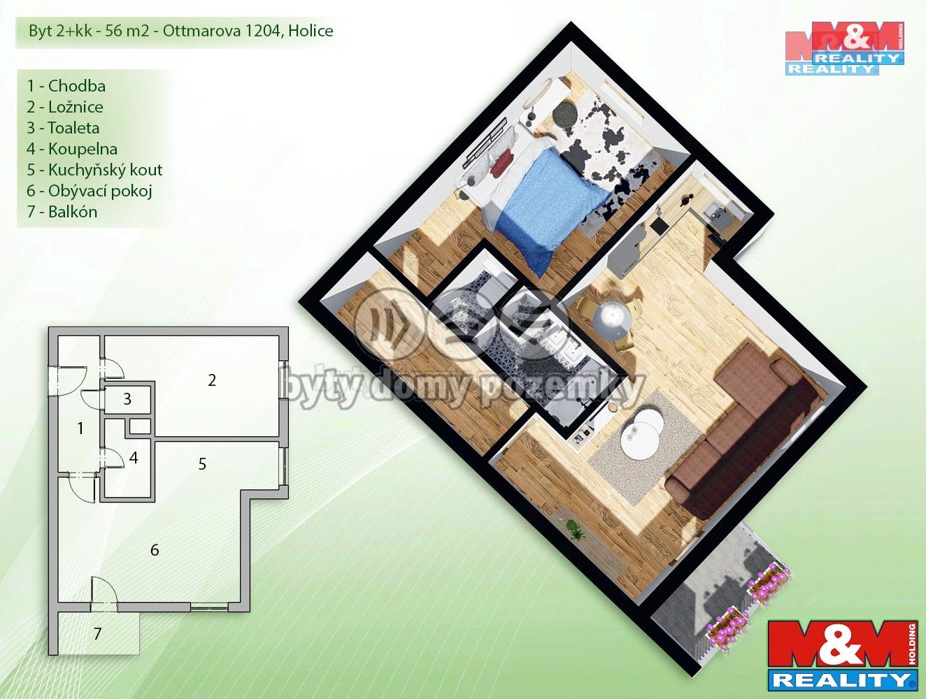 Rekonstruovaný družstevní byt, který se nachází ve 3. nadzemním podlaží revitalizovaného zděného domu v klidné lokalitě sídliště Muška. Dispozice je řešena jako 2+kk o celkové ploše 56 m2. Skládá se z předsíně, koupelny, WC, obývacího pokoje propojeného s kuchyňským koutem, ložnice a balkonu. V přízemí domu je sklep (1,94 m2), kolárna a kotelna s centrálním kotlem k vytápění celého bytového domu. V obytných místnostech je plovoucí podlaha, v ostatních místnostech je keramická dlažba. Byt je vybaven klimatizací. Přijatelné měsíční náklady na provoz. Bezproblémové parkování přímo u domu. Veškerá občanská vybavenost v dochozí vzdálenosti. Výborné autobusové a vlakové spojení do okolních měst. Město nabízí mnoho pracovních příležitostí. Díky všem těmto aspektům jsou Holice velmi vyhledávanou lokalitou pro bydlení. K nastěhování dle domluvy. Na bytě je anuita. Zajistím optimální financování. Doporučuji prohlídku, rád Vás nemovitostí osobně provedu.